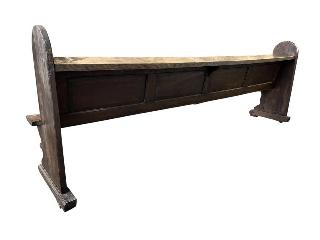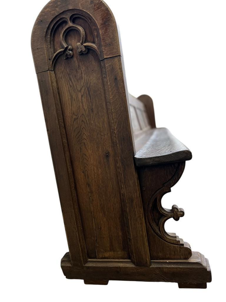 300 x 61 x 105 h, zithoogte 48,5 cm , 19de eeuwse kerkbank in gotische stijl, massief eik, vermoedelijk zelfs van voor 1850 gezien men groot. deel met houten slagpinnen heeft gedaan