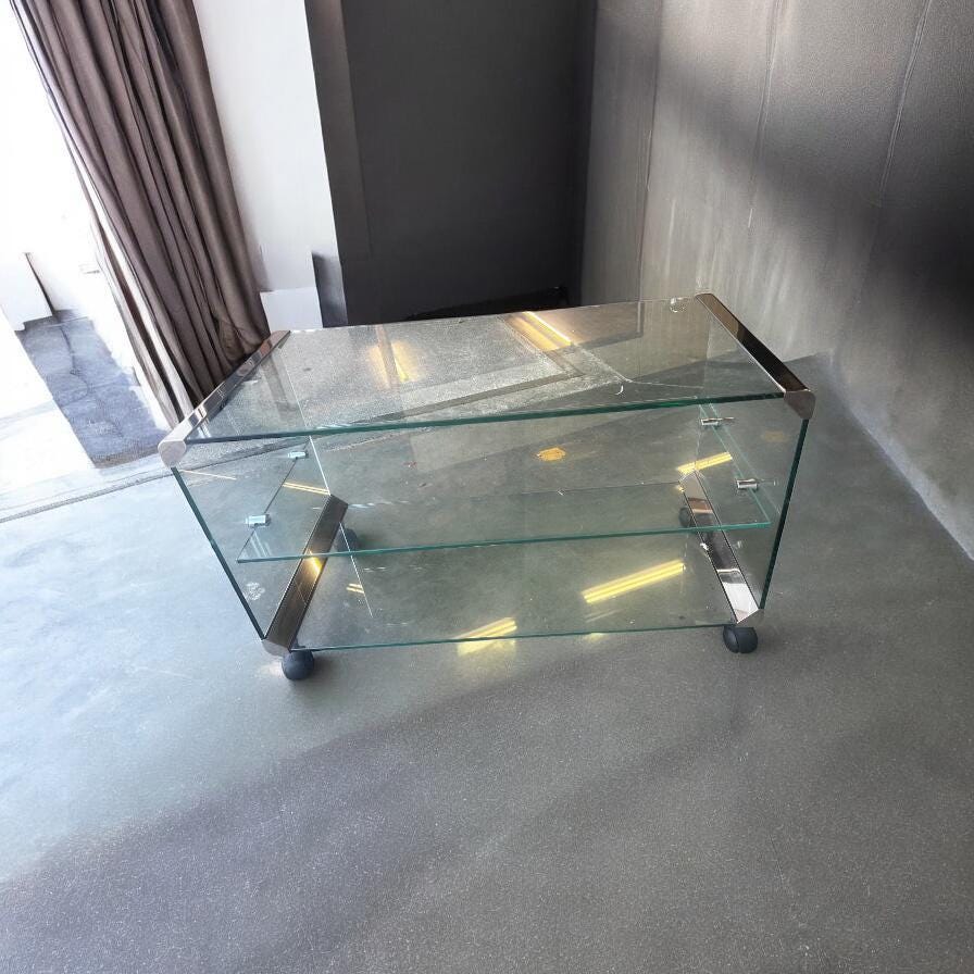 Retro audio meubel in glas met metaal accent van Italiaans ontwerpop wieltjes
