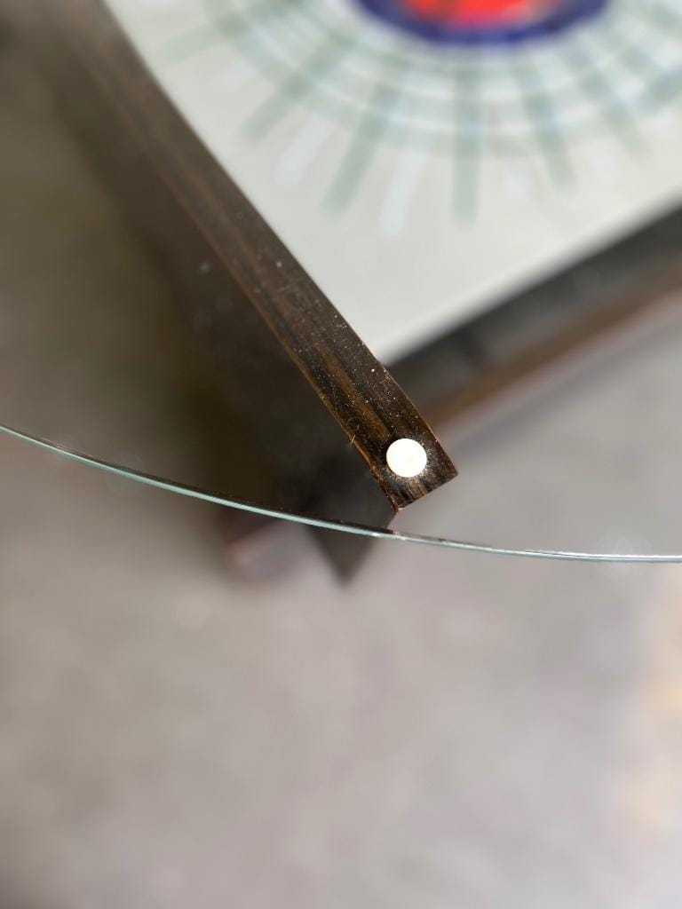 Retro coffee table met glazen blad, frame is in donker fineerhout met seventies tegelwerk
