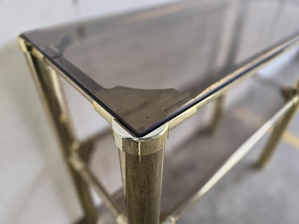 Retro staande rek / hollywood regency sidetable met fumé glazen leggers