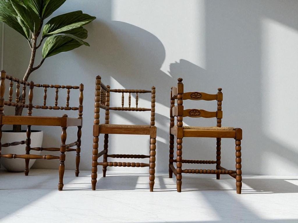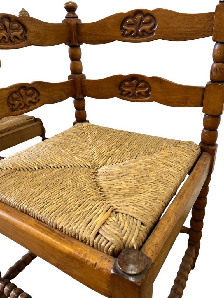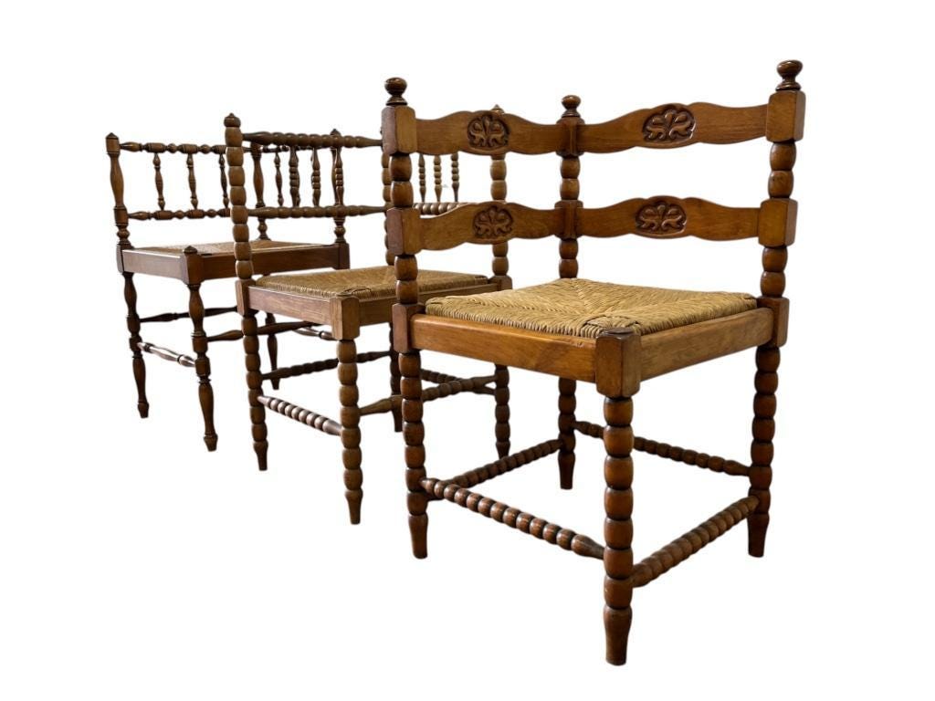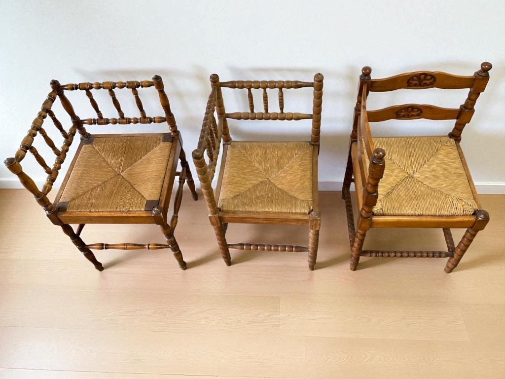 43 x 43 x 73hAuthentieke <strong>houten stoel</strong> met <strong>spilvormige rugleuning</strong> en een <strong>handgeweven zitting</strong>. Traditioneel vakmanschap in landelijke stijl, perfect als decoratief accent of extra zitplaats in een <strong>boho, farmhouse of retro interieur</strong>.<ul><li>Stevig en elegant ontwerp</li><li>Natuurlijke materialen: hout & gevlochten zitting</li><li>Landelijk, bohemian, vintage vibes</li></ul>Vintage rotan hoekkastje – retro boho design