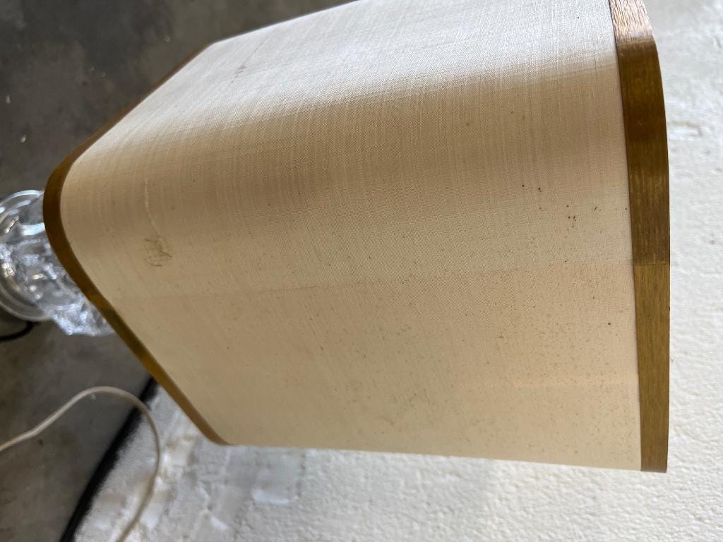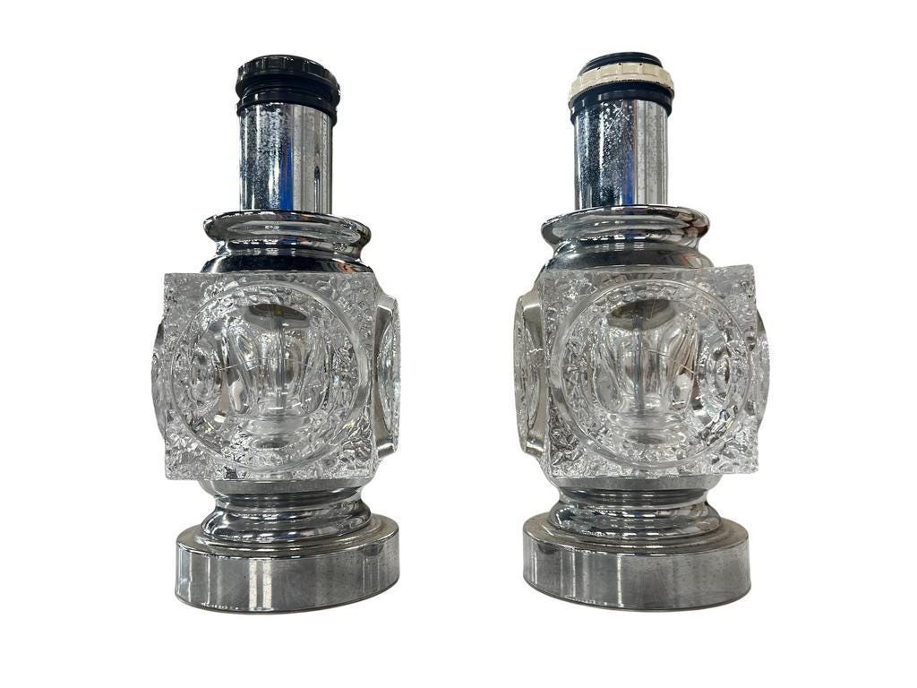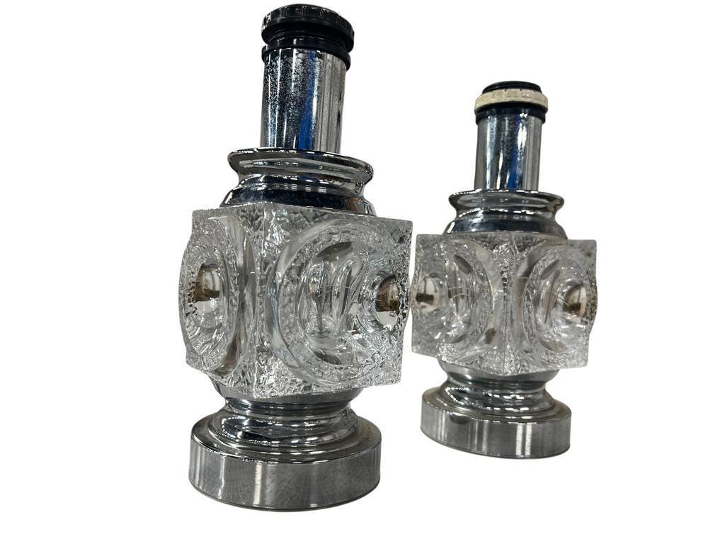 2 retro lampjes met chromen voet en glazen middenstuk in de vorm van een ijsblokje.