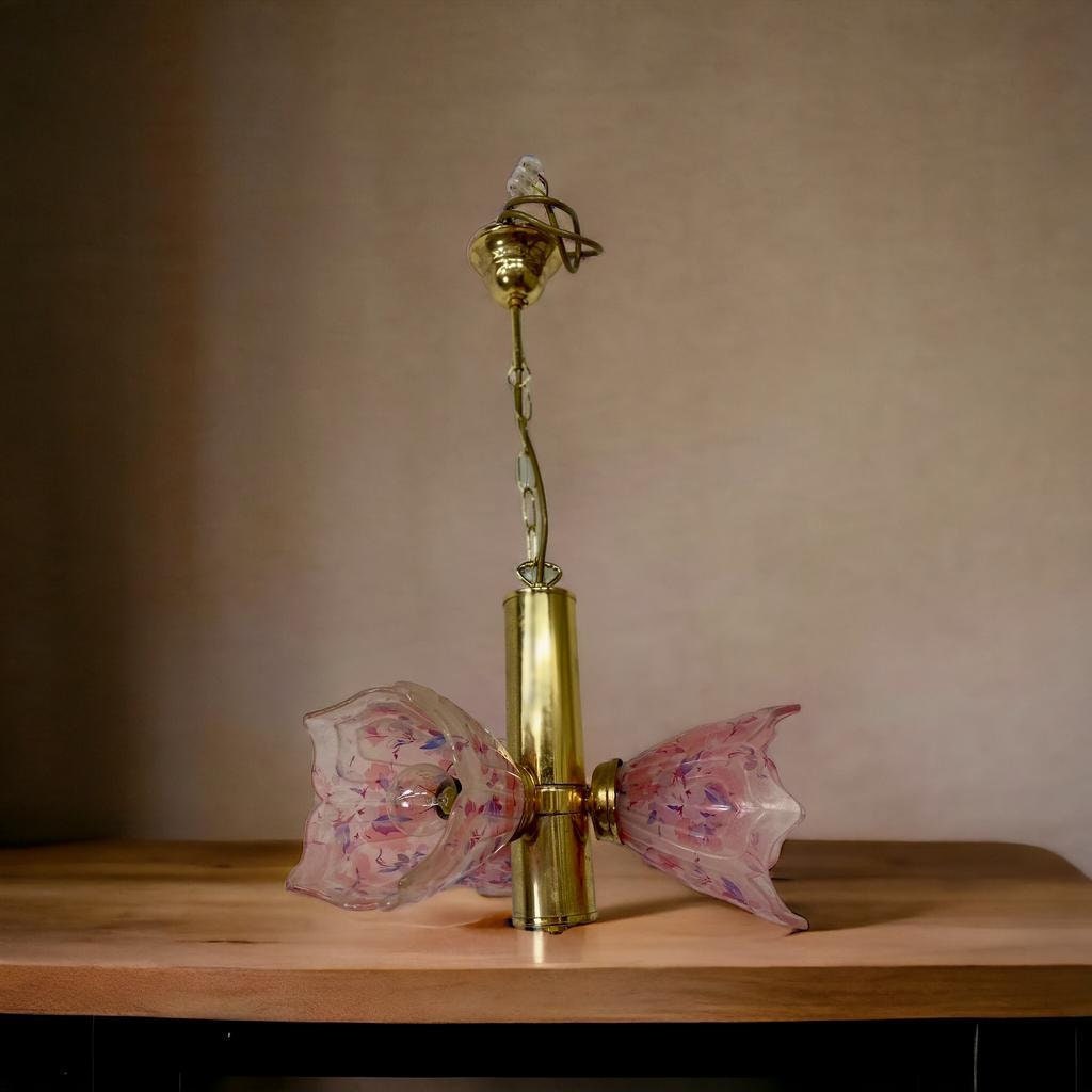 Vintage messing sputnik luster met roze kapjes