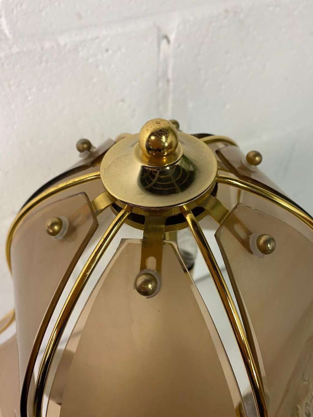 43x43x62hVintage 'gouden' tafellamp / Hollywood regency verlichtingRetro lamp met 3 lichtpunten en glazen fumé elementen