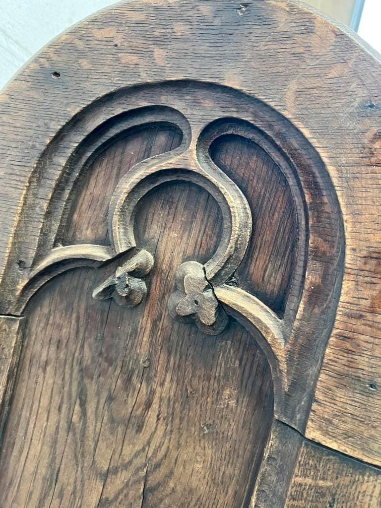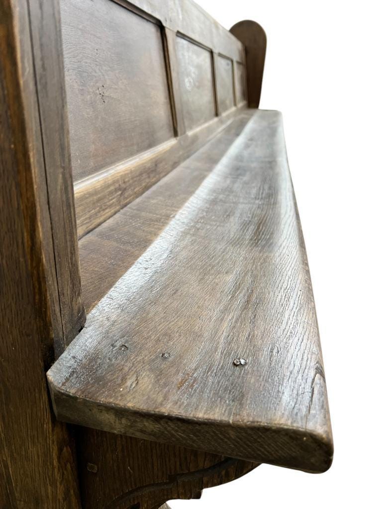 300 x 61 x 105 h, zithoogte 48,5 cm , 19de eeuwse kerkbank in gotische stijl, massief eik, vermoedelijk zelfs van voor 1850 gezien men groot. deel met houten slagpinnen heeft gedaan