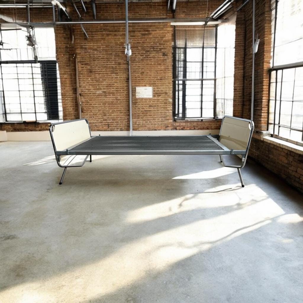 Retro metalen bedframe , ontworpen door Wim Rietveld in de jaren 50, met zijn typische chromen frame.