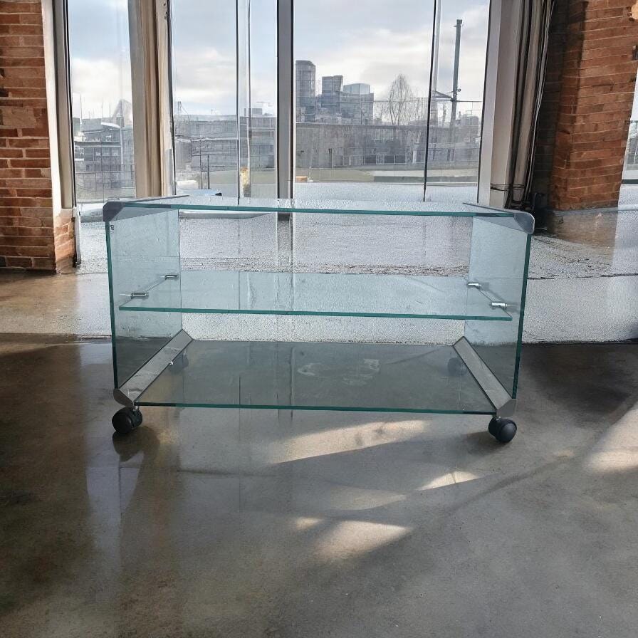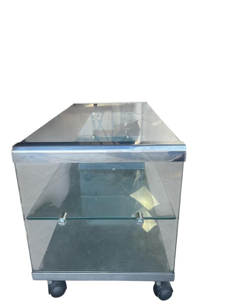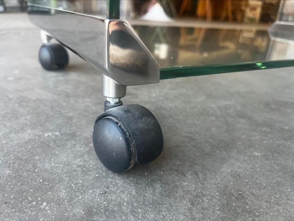 Retro audio meubel in glas met metaal accent van Italiaans ontwerpop wieltjes