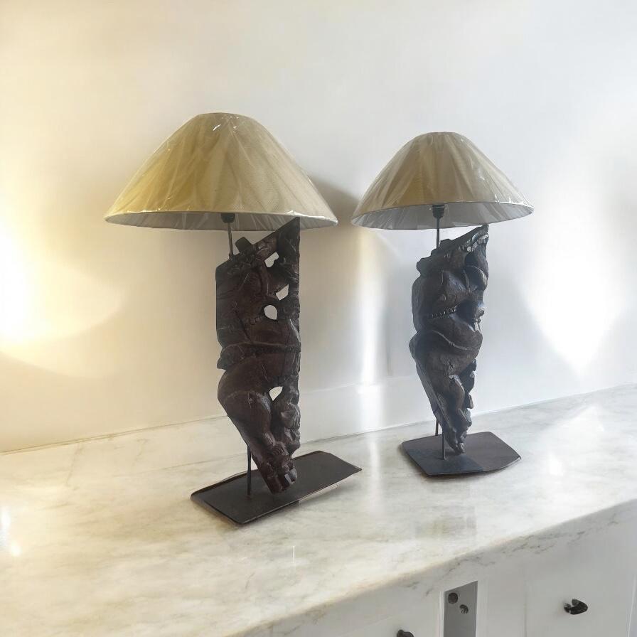 2 oude voeten in gekarfd hout (mogelijk van oude antieke tempel uit Indië) , de kappen erop zijn nieuw, maar eentje heeft plekken.