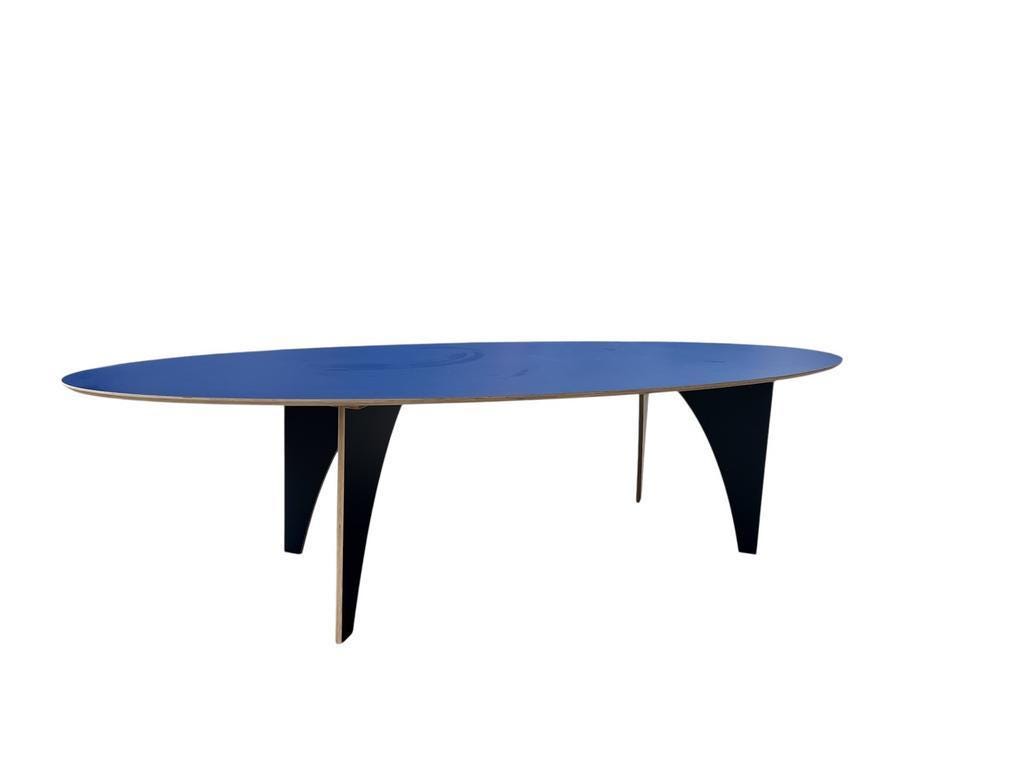 Houten lange tafel in de primaire kleur blauw, eigen ontwerp