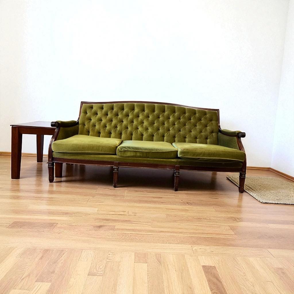 Vintage mosgroene zetel / chesterfield / canapé
