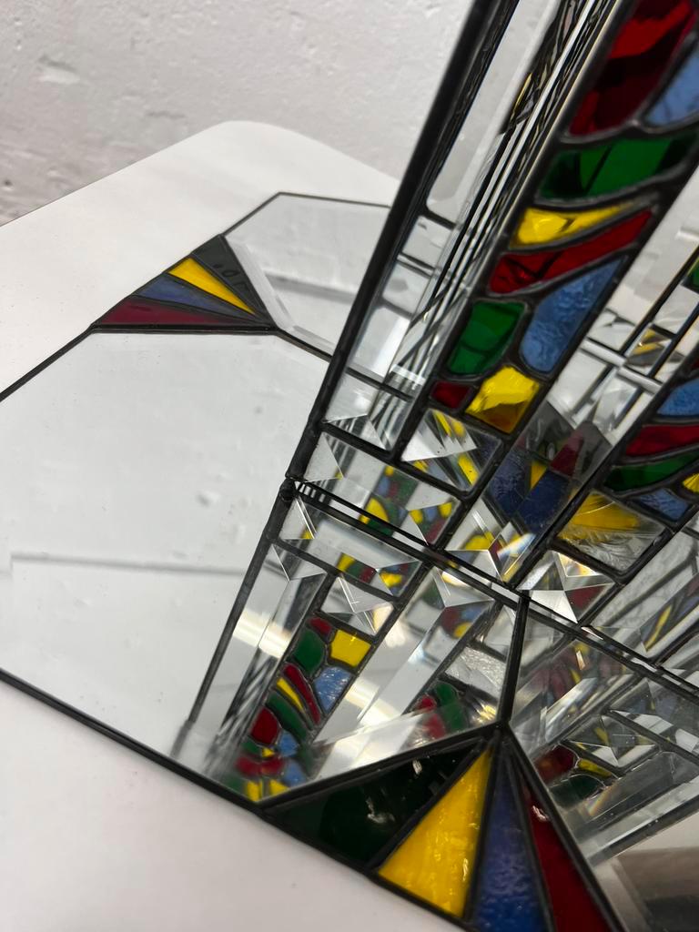 Oude handmade decoratie van glas in lood, 2 delig, huisje en spiegelvoet waar dezelfde kleuren in terugkomensetprijs