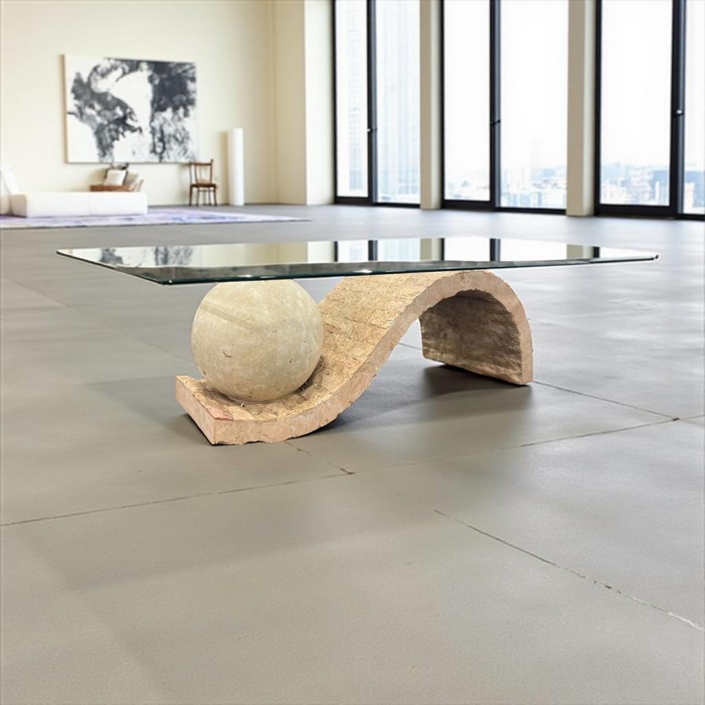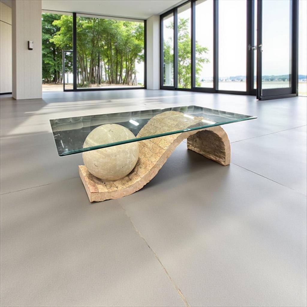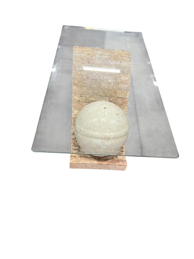 Retro coffee table in mactan steen met glazen plaat (facet gesneden)design jaren 80