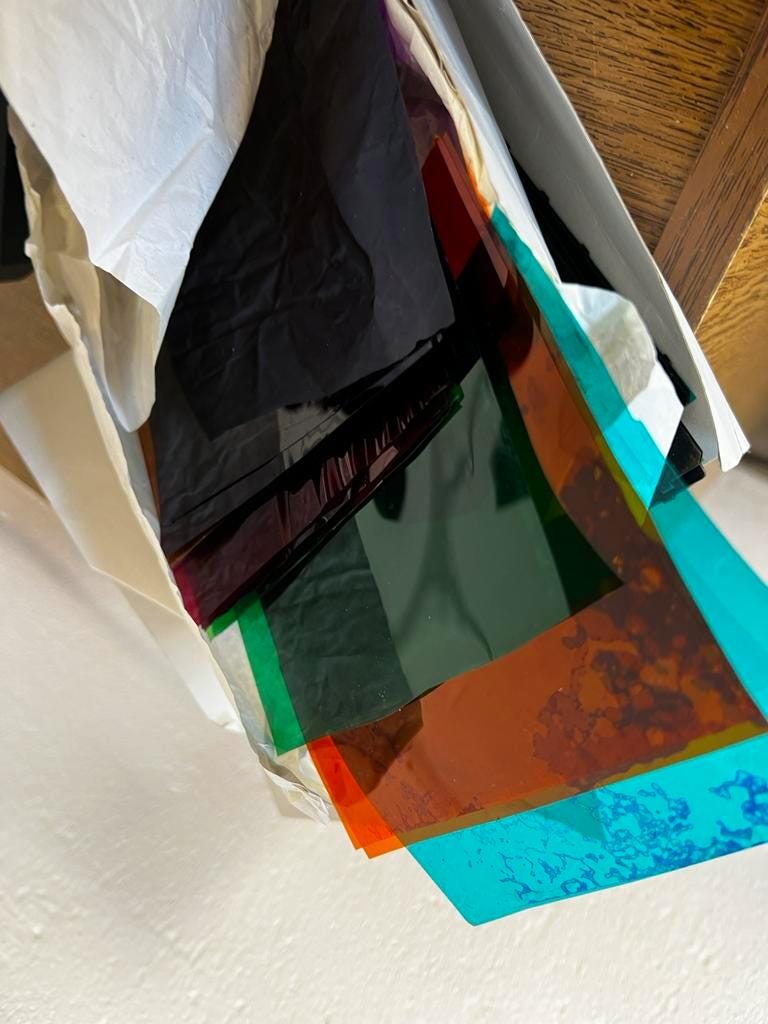 2 oude schijnwerpers, werkend met meerdere kleurhoesjes