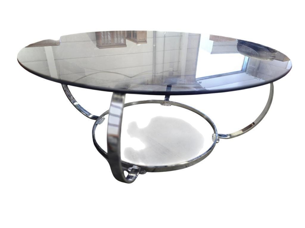 retro ronde salontafel in gerookt. glas met chromen frame