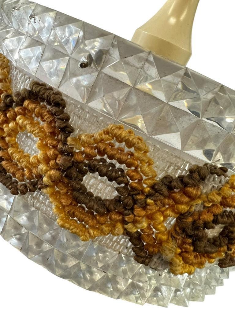 Deze jaren 70 lamp is aan buitenzijde kunststof met garen accent in bruine en gele tinten, binnenzijde glazen kap