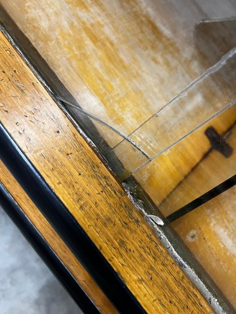 retro winkelmeubeilair , de ruiten vooraan hebben 2 barstjes, deze zijn vastgelijmd.Achteraan is de middelste schuifdeur van de 3 schuifdeuren gelijmd