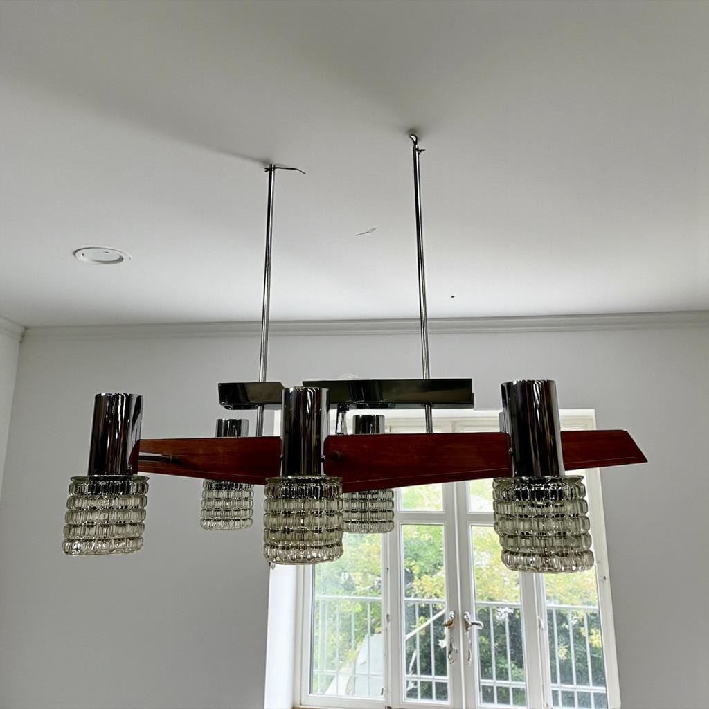 Vintage luster met 6 lichtpunten : glas & chroom & hout